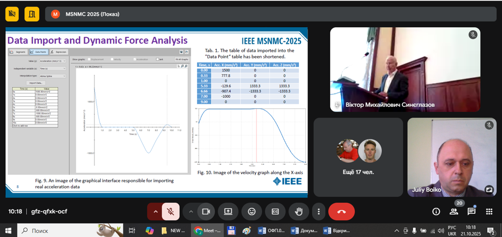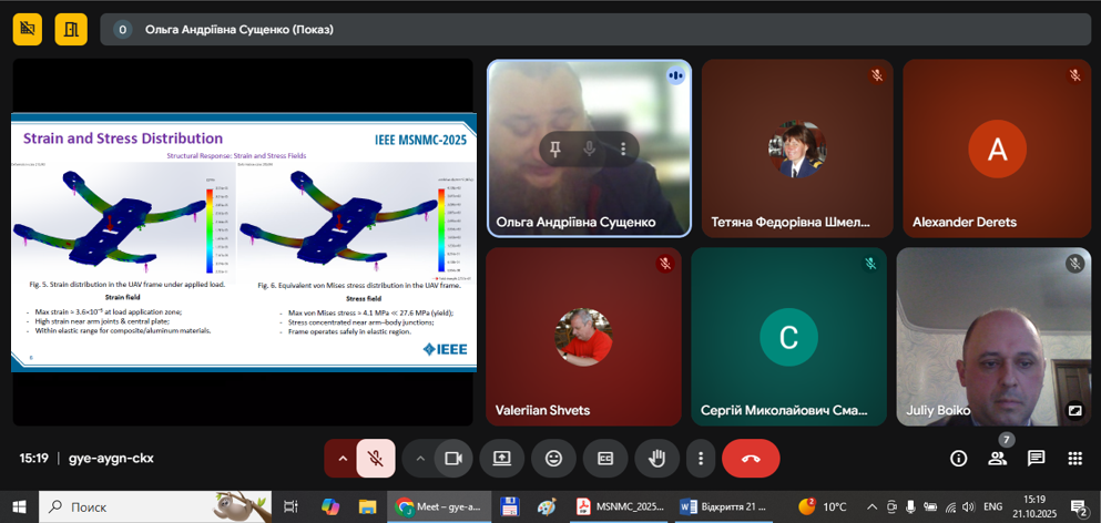 На секції «Navigation and Flight Systems Methods and Simulation» професор Юлій БОЙКО представив доповідь на тему «Modeling of Mechanical Loads on UAV Structures Using MEMS Accelerometer Data and FEM-Based SolidWorks Simulations», у якій представлено методологію інтеграції даних МЕМС-акселерометрів (мікроелектромеханічних) із моделюванням у середовищі SolidWorks Motion для аналізу механічних навантажень безпілотних літальних апаратів (БПЛА). Результати дослідження продемонстрували можливість використання сенсорних даних не лише для навігації, а і для оцінки напружено-деформованого стану конструкцій БПЛА, що відкриває нові перспективи для оптимізації аерокосмічних платформ і зменшення витрат на прототипування. Представлене дослідження показує міждисциплінарну перспективу, важливу також для аерокосмічної інженерії, приладобудування та розробників безпілотних систем. Інтеграція аналізу телекомунікаційних даних із методами механічного моделювання створює нові можливості для підвищення надійності, зменшення маси конструкцій і розроблення інтелектуальних систем моніторингу стану БПЛА. Такий підхід відкриває шлях до спільних інженерних рішень для галузей телекомунікацій, приладобудування, аеродинаміки, мехатроніки та систем керування, що відповідає сучасним тенденціям розвитку технологій 5G/6G, IoT і Smart Mobility.