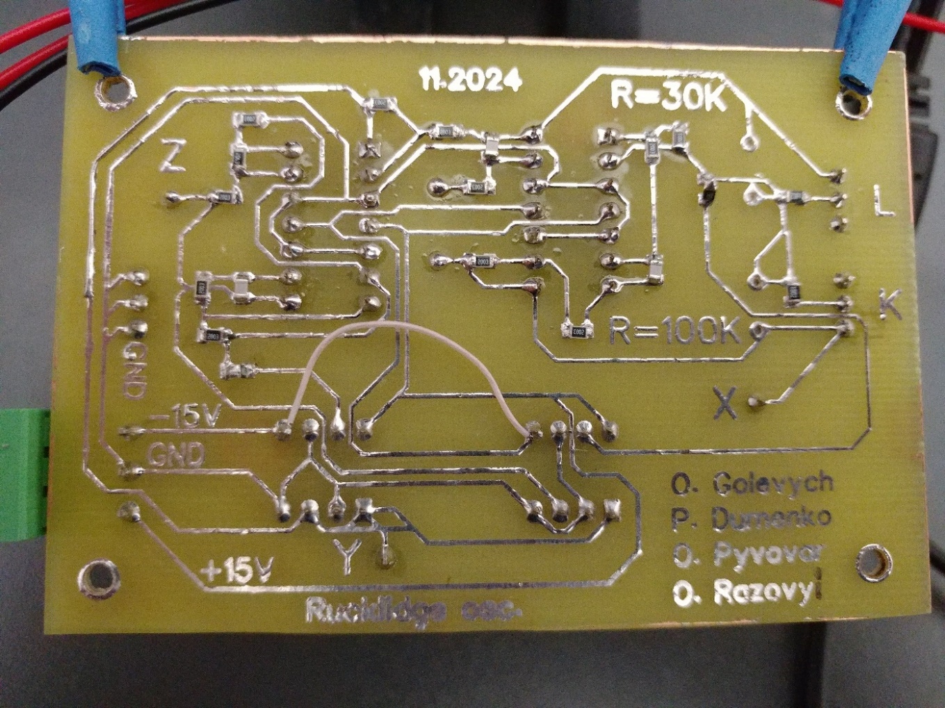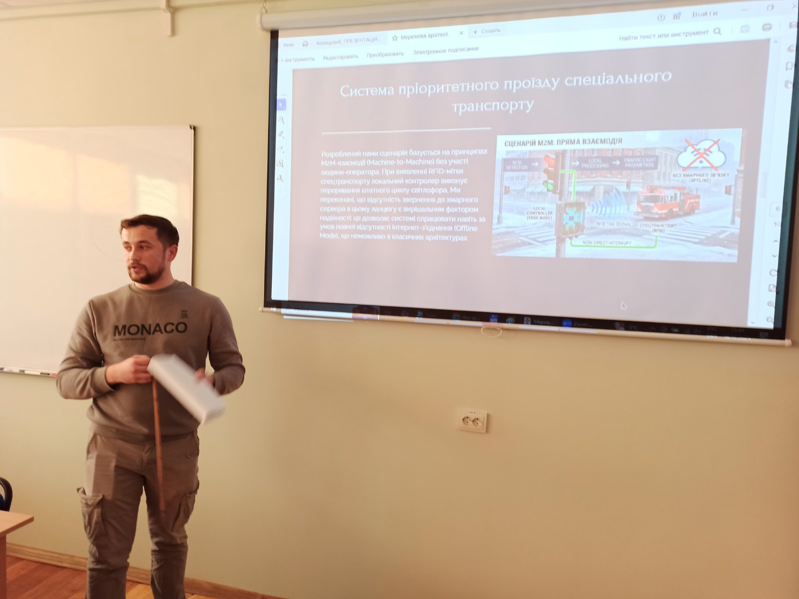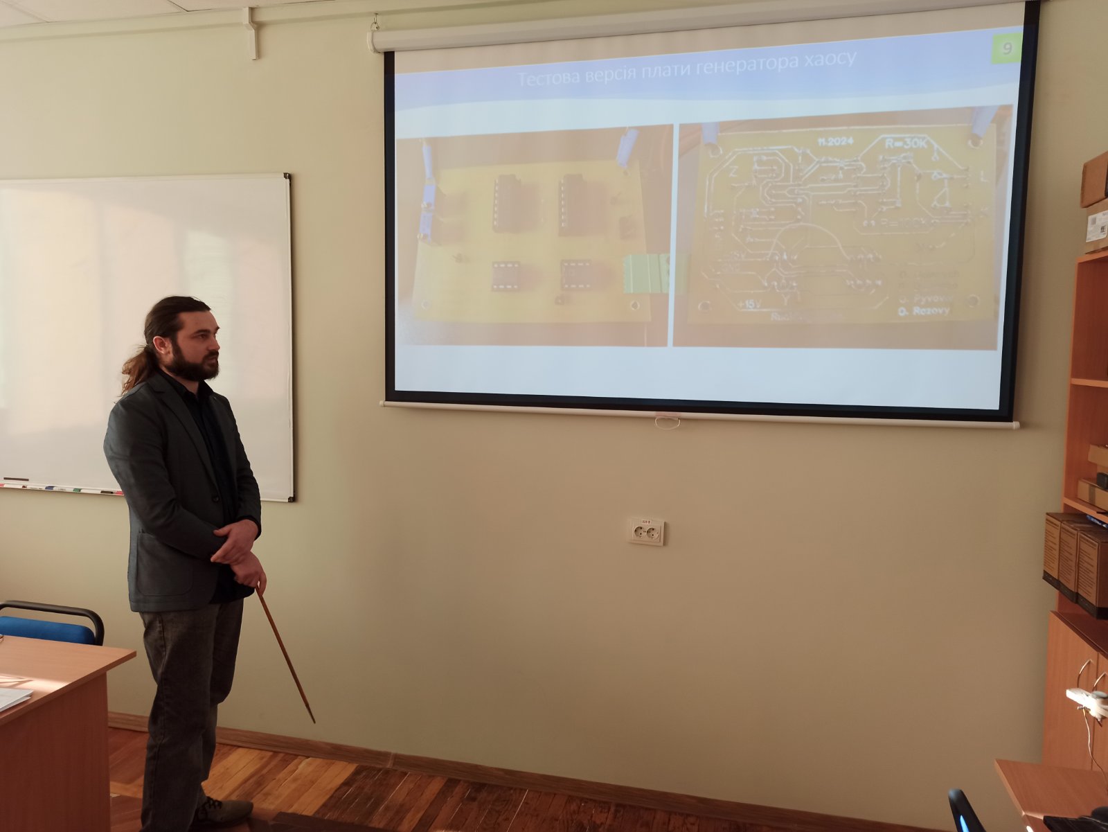 Особливу зацікавленість Екзаменаційної комісії викликала магістерська робота студента групи ЕКРм-24-1 Олександра РАЗОВОГО на тему «Метод відновлення значень біфуркаційних параметрів хаотичного генератора» (науковий керівник к.т.н., доцент Олег ПИВОВАР, науковий консультант канд. техн. наук Олег ГОЛЕВИЧ). Під час захисту здобувач представив діючий апаратний макет хаотичного генератора, що використовувався як експериментальний стенд у режимі реального часу. У роботі запропоновано метод відновлення біфуркаційних параметрів на основі цифрової обробки часових рядів фазових змінних, реалізовано апаратно-програмний прототип з Bluetooth-керуванням та OLED-індикацією, а також досягнуто точності оцінювання параметрів на рівні до 1%. Отримані результати мають практичну цінність і можуть бути використані в подальших дослідженнях хаотичних сигналів та розробці перспективних телекомунікаційних і вбудованих систем.