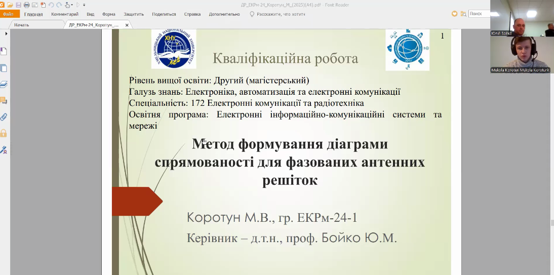 Під час захисту кваліфікаційних робіт здобувачі освітнього рівня «магістр» групи ЕКРм-24-1 продемонстрували високий рівень фахової підготовки, здатність до самостійного наукового пошуку та глибоке розуміння сучасних тенденцій у сфері електронних комунікацій. Кожна робота вирізнялася структурованістю, науковою аргументованістю та практичною значущістю, а здобувачі впевнено відповідали на запитання членів комісії, демонструючи обізнаність у деталях проведених досліджень.