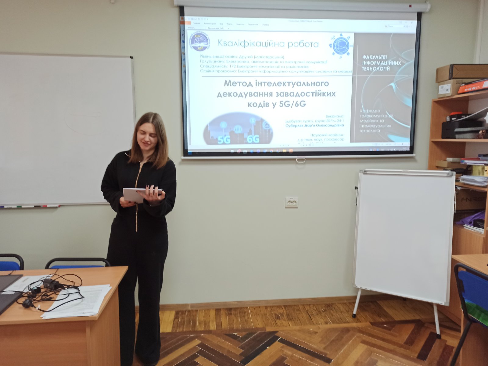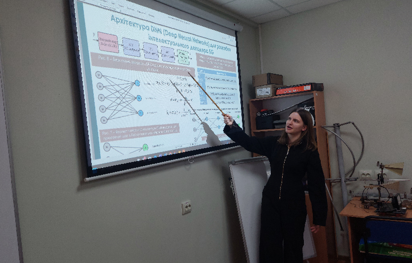 Особливої уваги цього року заслуговують роботи, у яких простежується інтеграція проривних технологій штучного інтелекту. Використання методів глибокого машинного навчання для інтелектуального декодування, оптимізації променеформування та аналізу хаотичних процесів повністю відповідає світовим трендам розвитку телекомунікацій 5G та майбутніх систем 6G, де штучний інтелект відіграватиме ключову роль у реалізації нових сервісів, підвищенні надійності та ефективності інформаційно-комунікаційної інфраструктури. Зокрема, результати магістерського дослідження студентки групи ЕКРм-24-1 Дар’ї СУБЕРЛЯК на тему «Метод інтелектуального декодування завадостійких кодів у 5G/6G» (науковий керівник д.т.н., професор Юлій БОЙКО) будуть впроваджені під час виконання госпдоговірної науково-дослідної теми «Розробка та дослідження методів високоточного Wi-Fi позиціонування та завадостійкої обробки сигналів у мережах абонентського доступу» (шифр 59-2025, номер державної реєстрації 0125U003532), що виконується у 2025–2026 роках на замовлення телекомунікаційної компанії X-City. При цьому Дар’я СУБЕРЛЯК брала безпосередню участь у виконанні зазначеної госпдоговірної теми як виконавець, зосереджуючись на розробці та оптимізації алгоритмів завадостійкої обробки багатопозиційних сигналів у сучасних телекомунікаційних системах абонентського доступу. Крім того, у ході круглого столу зі стейкхолдерами та здобувачами було сформульовано запит на вдосконалення змісту освітніх компонентів освітньої програми з метою поглибленого розгляду проривних трендів в електронних комунікаціях, зокрема технологій штучного інтелекту (https://surl.li/yavygm, https://surl.li/oazbak) та машинного навчання, що було враховано під час оновлення та впровадження освітньої програми «Електронні системи та мережі комунікацій» за спеціальністю G5 «Електроніка, електронні комунікації, приладобудування та радіотехніка», яка прийшла на зміну освітній програмі «Електронні інформаційно-комунікаційні системи та мережі» у зв’язку зі зміною назви спеціальності.