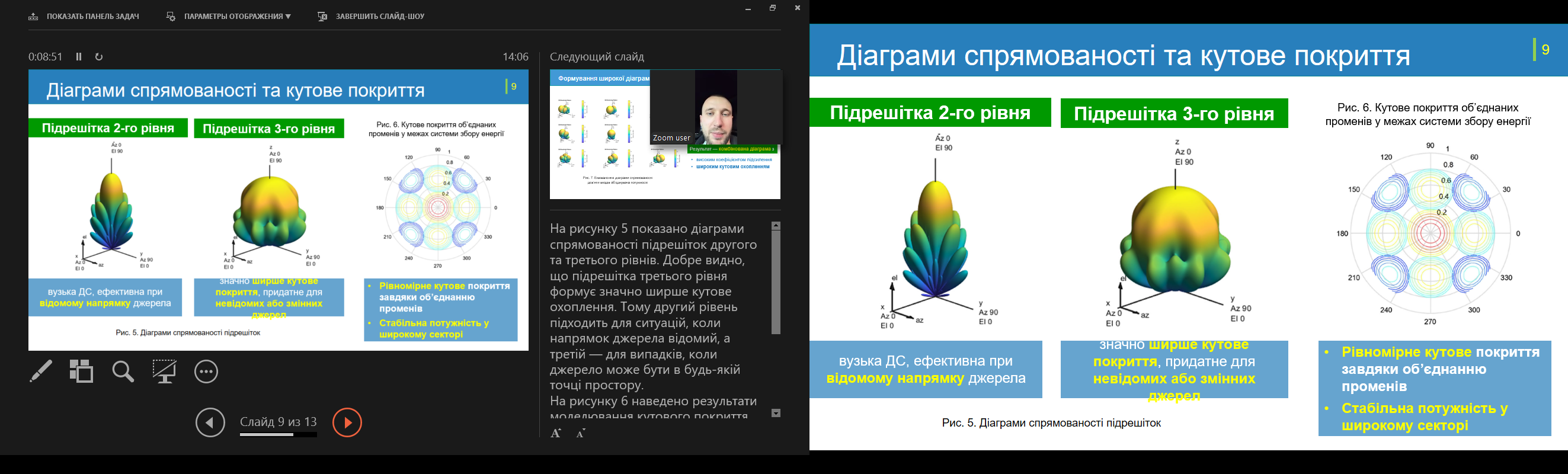 Серед представлених досліджень — антенна решітка GPS сигналу на базі спіральних та патч-антен, імпульсний магнітно-плазмовий компресор для антибактеріальної та стерилізаційної обробки матеріалів, інфокомунікаційна система екзаменаційно-тренінгового центру іноземних мов, метод формування діаграми спрямованості для фазованих антенних решіток, мережева архітектура «розумного міста» з використанням IoT-рішень, метод відновлення біфуркаційних параметрів хаотичних генераторів, метод повного фазового зсуву для вимірювання кутів закручування валів, що обертаються, інтелектуальне декодування завадостійких кодів у системах 5G/6G на основі технологій штучного інтелекту та глибокого машинного навчання, а також інтелектуальна система збору бездротової енергії.